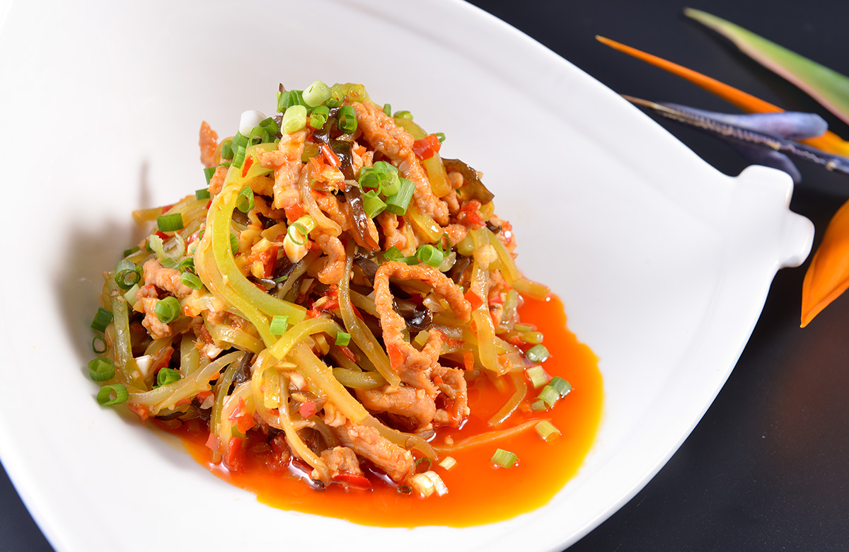 魚(yú)香肉絲(Fish-flavored Shredded Pork),是一道特色傳統(tǒng)名菜,以魚(yú)香味調(diào)味而得名,屬川菜。相傳靈感來(lái)自老菜泡椒肉絲,民國(guó)年間由四川籍廚師創(chuàng)制而成